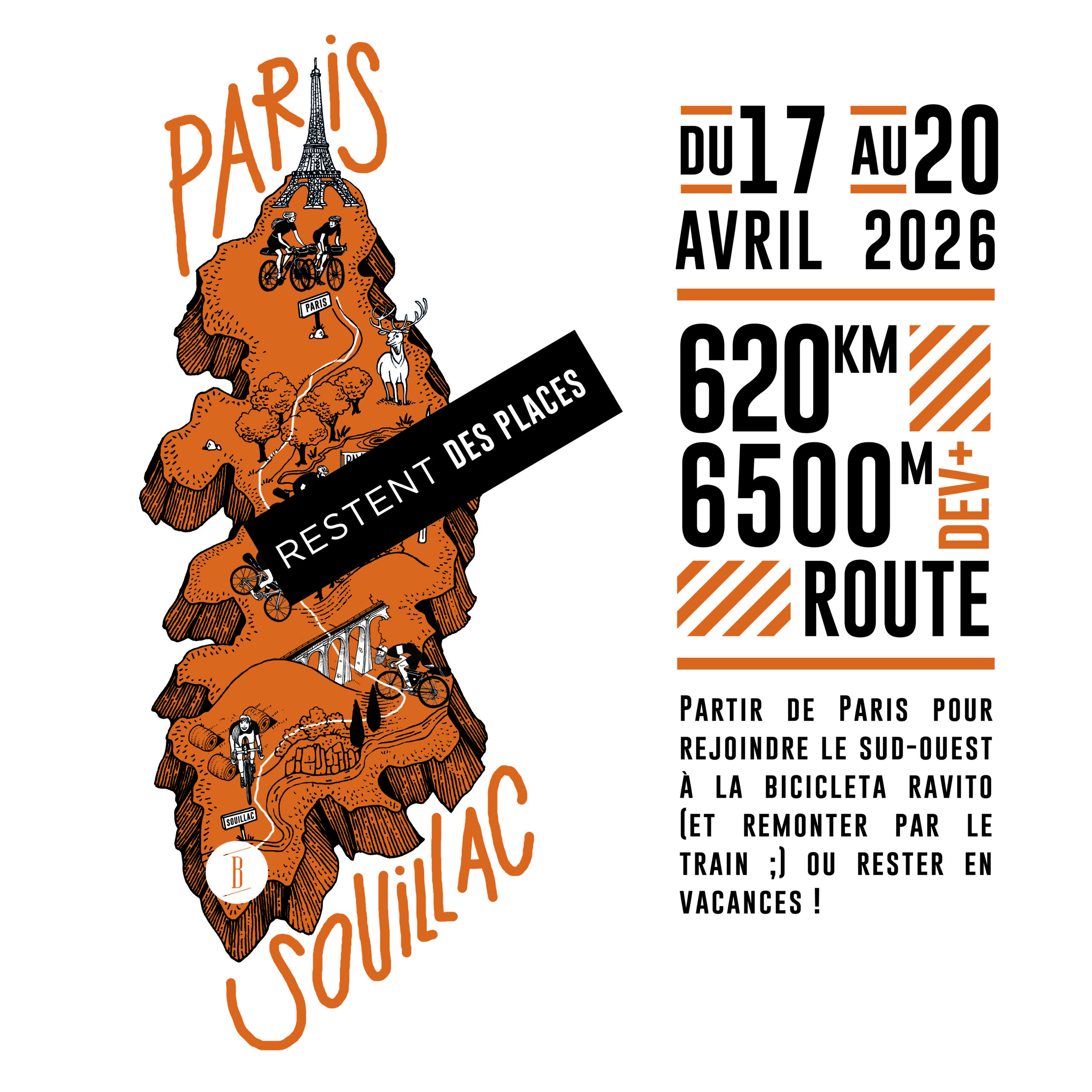 Deux Monts et Puy... Partir du pied du géant de Provence pour rejoindre la BICICLETA RAVITO en traversant l'Ardêche, les Cévennes, via le Mont Aigoual puis le Cantal et le Puy Mary avant de plonger vers l'arrivée. Près de 10 000 m de dénivelé positif sur 650km à parcourir à votre rythme en 4 jours maxi. Le mercredi 29 avril, l'accueil sera fera chez RÊVE DE VELO. Le départ aura lieu le jeudi 30 avril au matin, 8h00, chez RÊVE DE VELO. Vous avez 3 ou 4 jours pour relier LA BICICLETA RAVITO (soit avant le dimanche soir 3 mai, mais nous serons aussi ouverts le lundi 4 mai pour vous accueillir ;) Possibilité de dormir la veille au gîte sportif de ROULERAVENTOUX à Mormoiron, à 5km du départ. Pensez à réserver ! Du 30 avril au 3 mai 2026 / Accueil mercredi 29 avril chez RÊVE DE VELO / Départ RÊVE DE VELO, Bédouin, jeudi 30 avril - 8h00 Le tarif de 125€ comprend : -café et gâteau d’accueil le matin du départ -trace GPX vérifiée, roulée -ravito et checkpoint au premier tiers du parcours environ -repas à l'arrivée à LA BICICLETA RAVITO -cadeaux de Finishers.euses !du 30 avril au 3 mai 2026Bédouin Souillacroute650km -